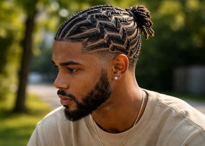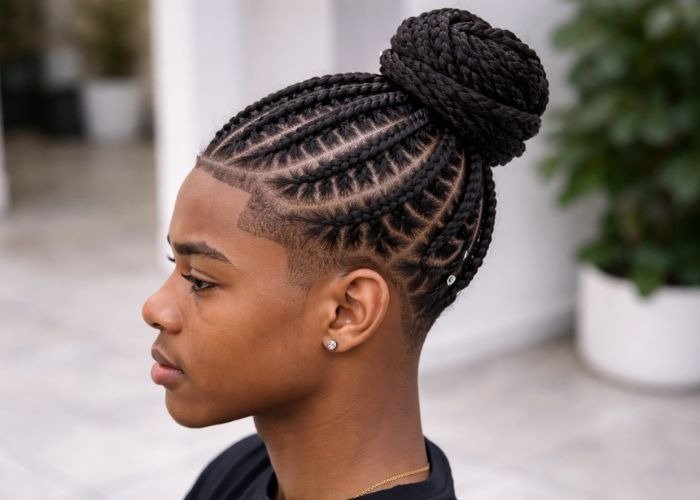 Braids are tied into a stylish man bun.