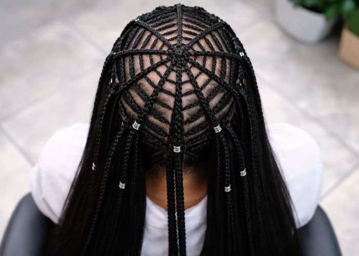 Braids radiate outward from a central point, resembling a spider web.